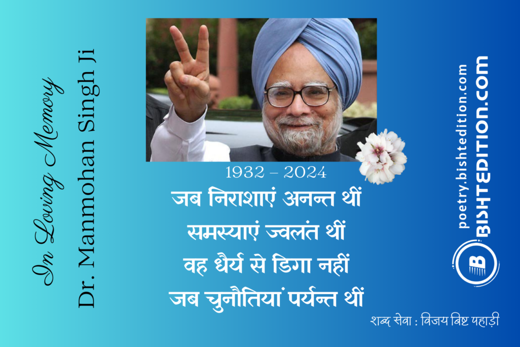 Here’s a tribute to the Revered Soul Dr. Manmohan Singh Ji   भारत को निराशाओं के गर्त से उबार कर उपलब्धियों के आसमान तक पहुंचाने के सूत्रधार रहे भारत के पूर्व प्रधानमंत्री डा० मनमोहन सिंह जी का दि० 26. 12. 2024 को अनन्त में विलीन हो गए । poetry.bishtedition.com डा० मनमोहन सिंह जी को श्रद्धांजलि […]